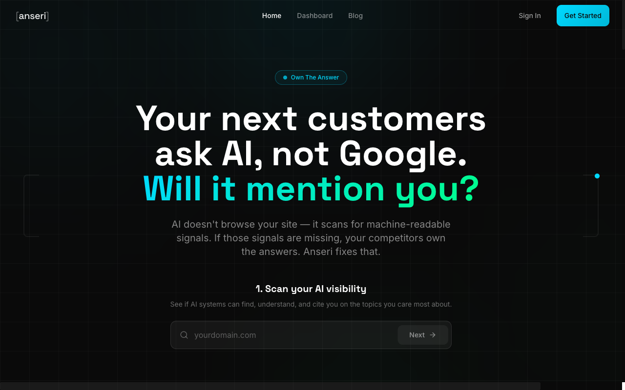 Explore brand solutionsAnseri shows you exactly how you show up in AI answers — and what it takes to become the source that gets selected, not just scraped.