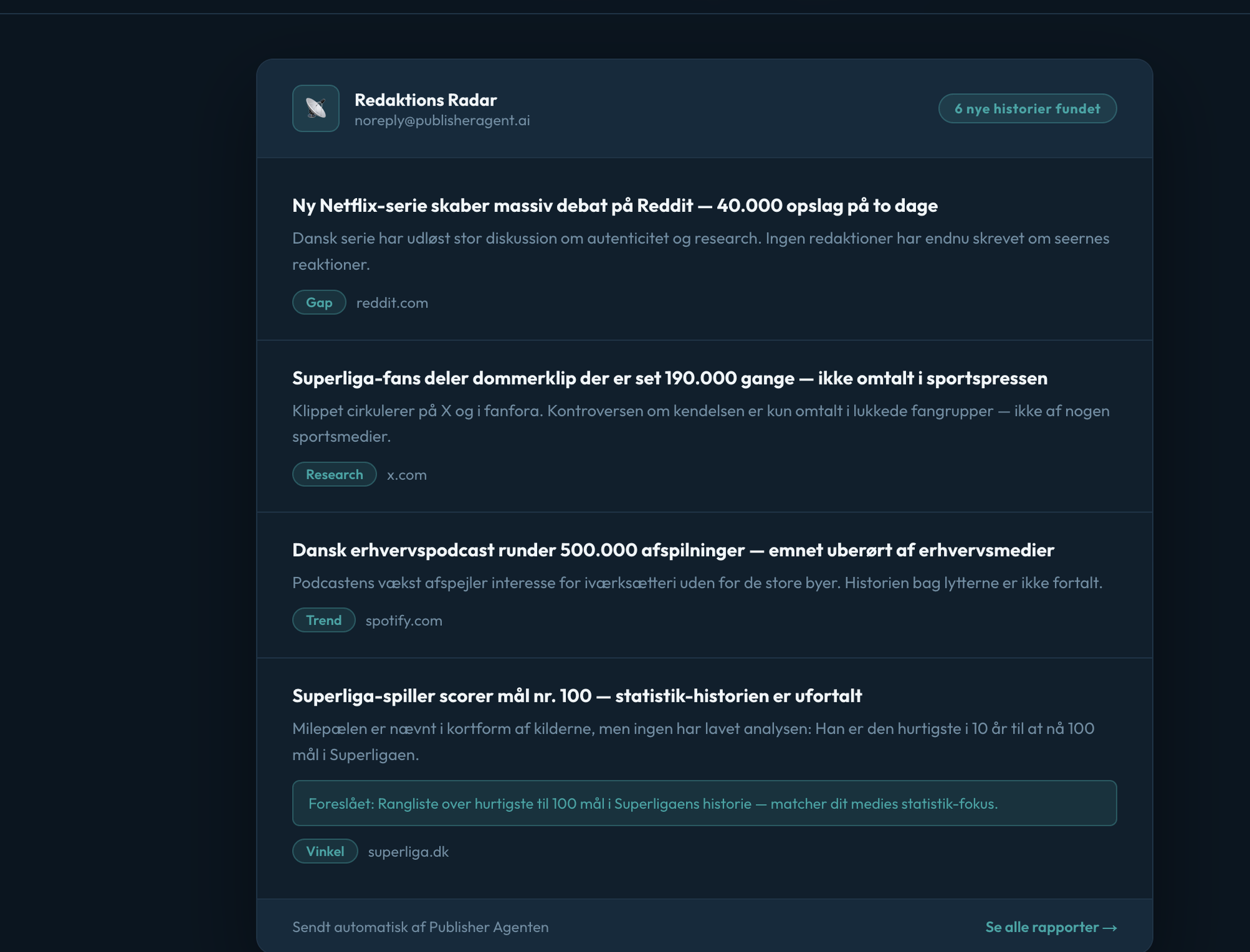 PublisherAgent is Redaktions Radar — a tool that finds the stories no one else has written yet. It maps out the editorial landscape, identifies whitespace, and delivers story suggestions to your newsroom every morning at 06:00. Used by KrimiNyt from day one.